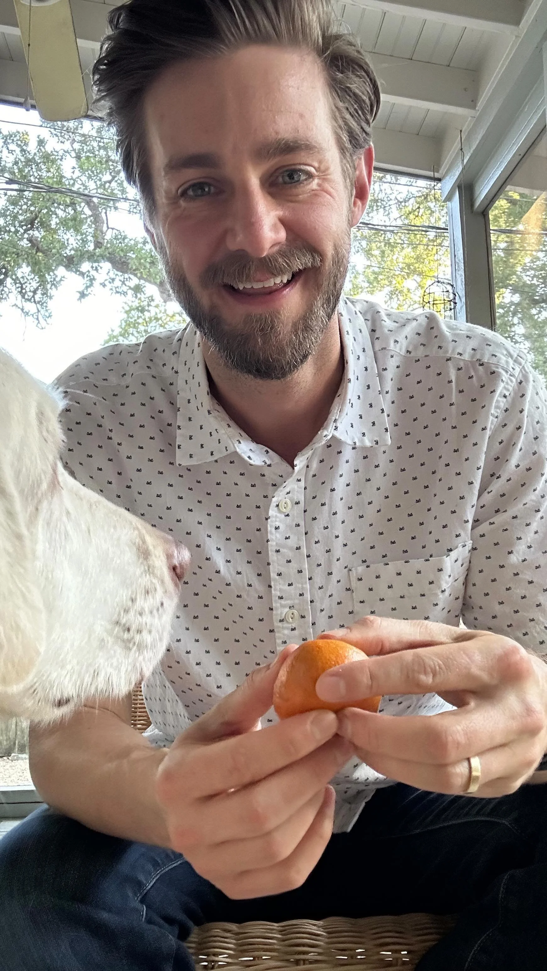 He lives with his wife, Elle, and their white Labrador, Lily, in Austin, Texas.